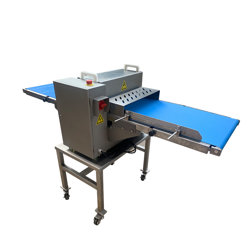 机身配备了调节厚度切割的旋转按钮,通过推杆进行无级调速用来满足不同规格切割的要求,腊肉切条机采用了预压力设计能够保证切割过程中块状大小的均匀,在单刃进行切割的时候肉类推杆会做步进运动,能够保证尺规格的合适。