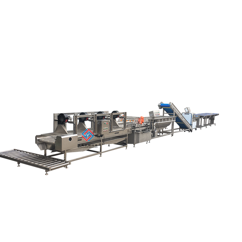 净菜加工生产线能够除去了果质腊、果蔬表面的聚合重金属、农药残留、分解防腐剂、除去了虫卵、并且让蔬菜能够保鲜,常见的工序有:挑选分拣蔬菜、清洗、切割、杀青、沥水、风干,之后可以通过小包装投放市场,目前已经广泛向大型食堂、企业、学校提供产品。